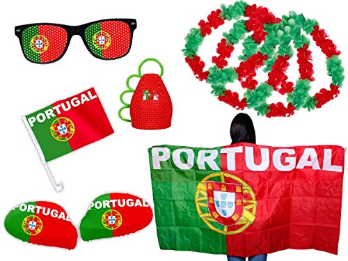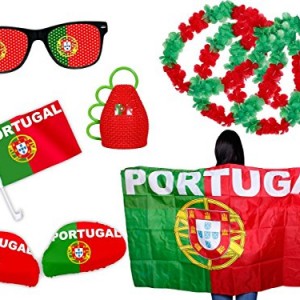 PROMOTION: Kit XXL supporter Portugal (FP-10) Ensemble de 10 pièces: 2 x housses pour rétroviseur , 1 x drapeau pour voiture ,1 x Cap poncho , 1 x Lunettes à grille à trous, 1 x Caxirola, 4 colliers rouge vert évenement sportif coupe du monde fête national accéssoire soirée pays